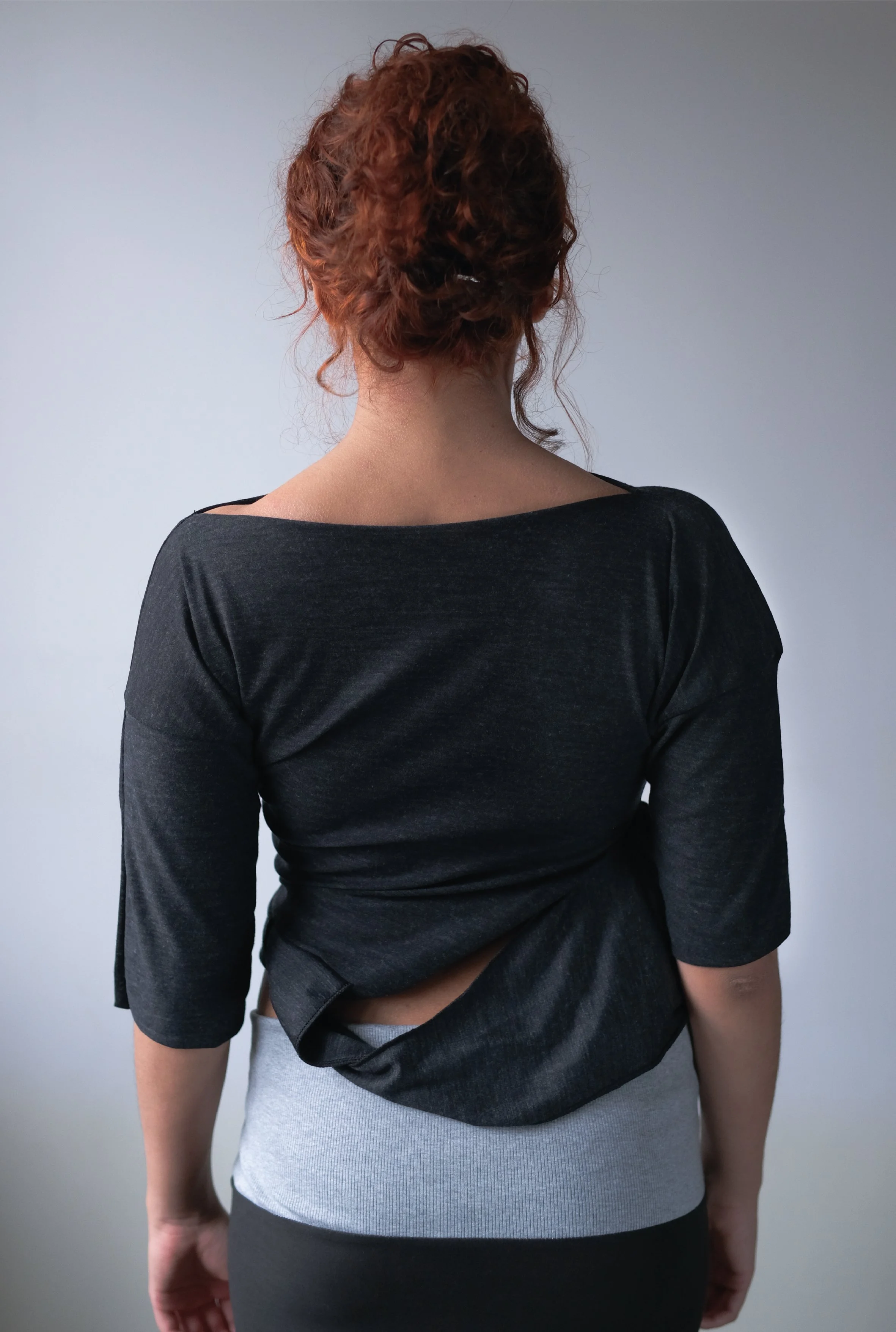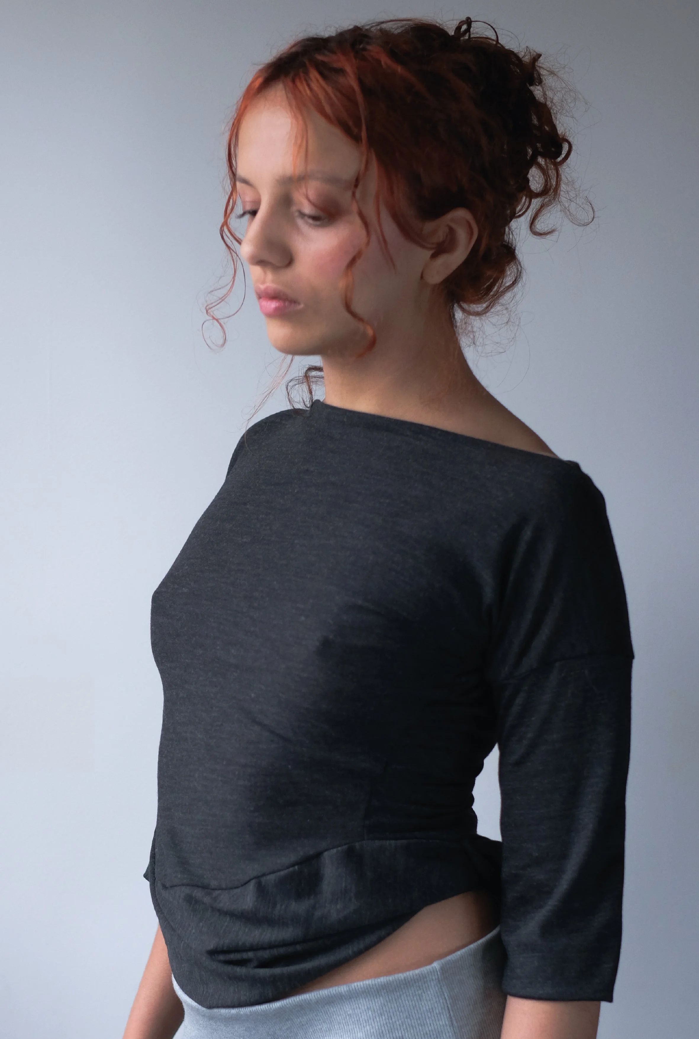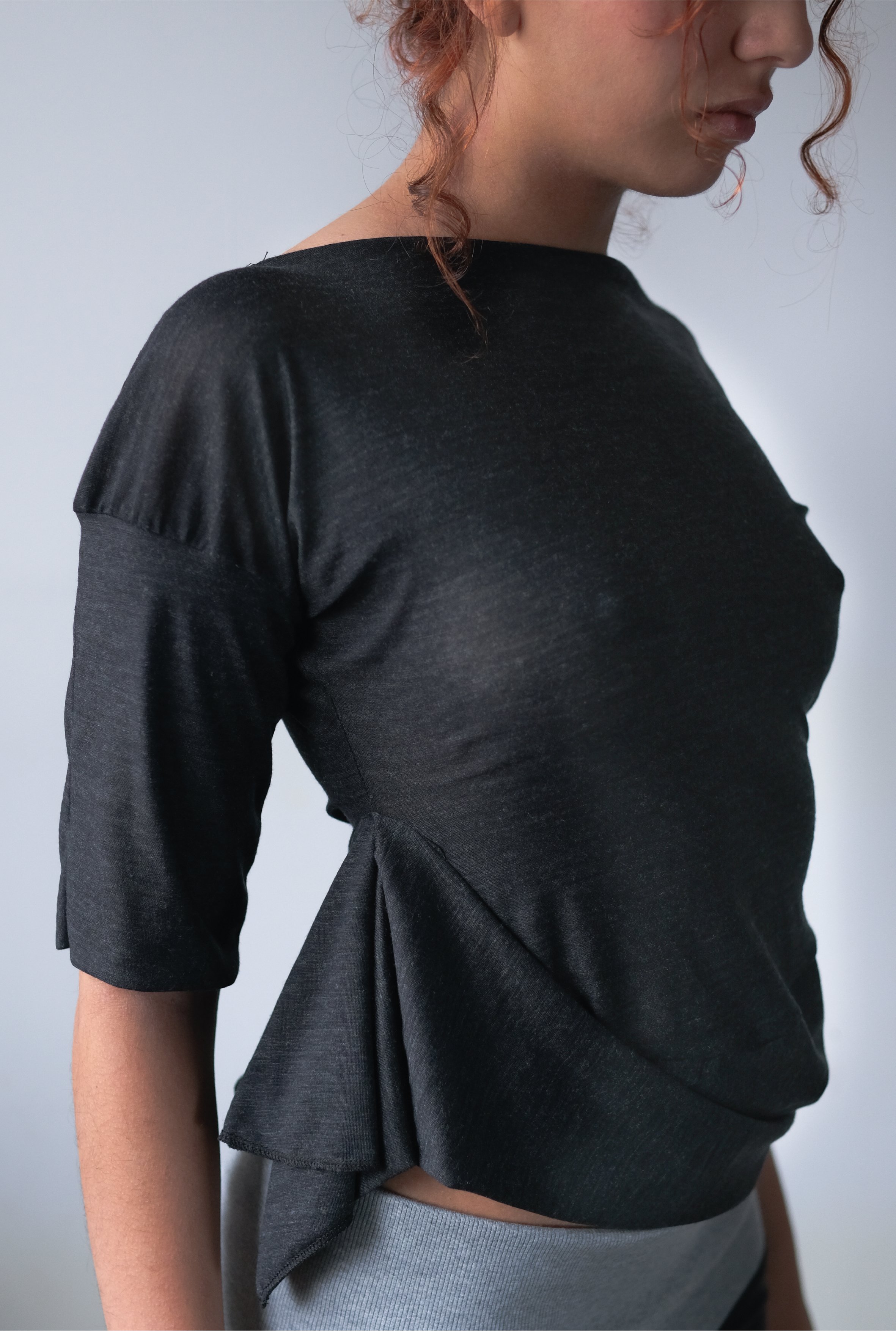 — Cropped fitted top with mid-length sleeves, with draped effect and ruffles