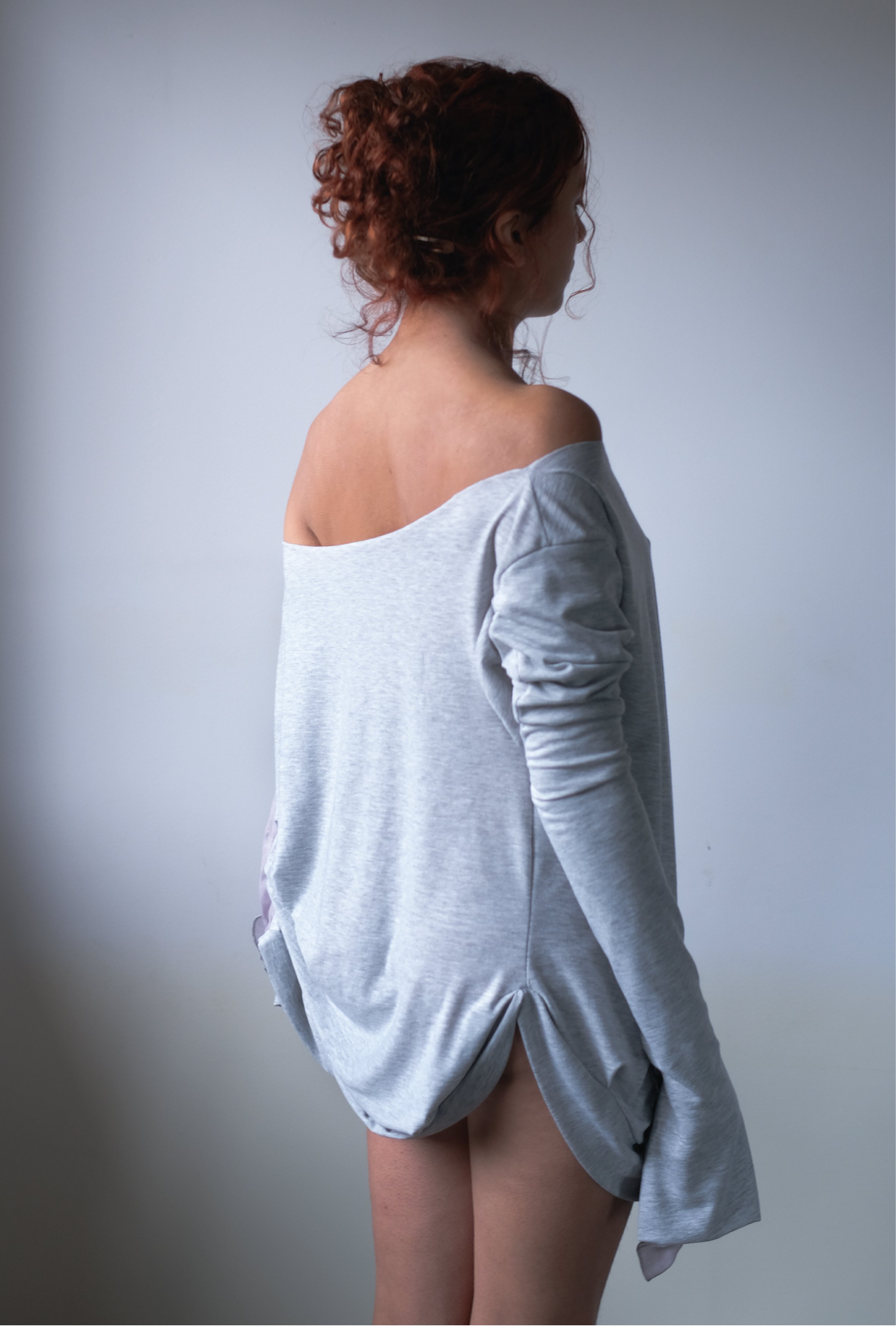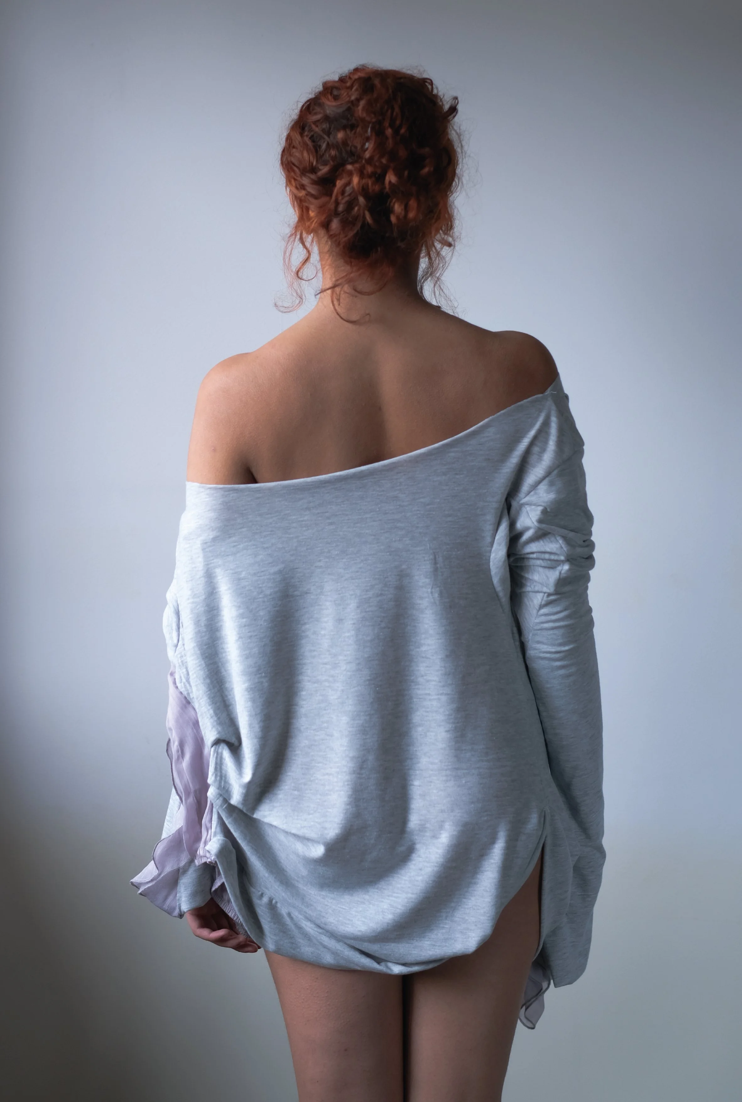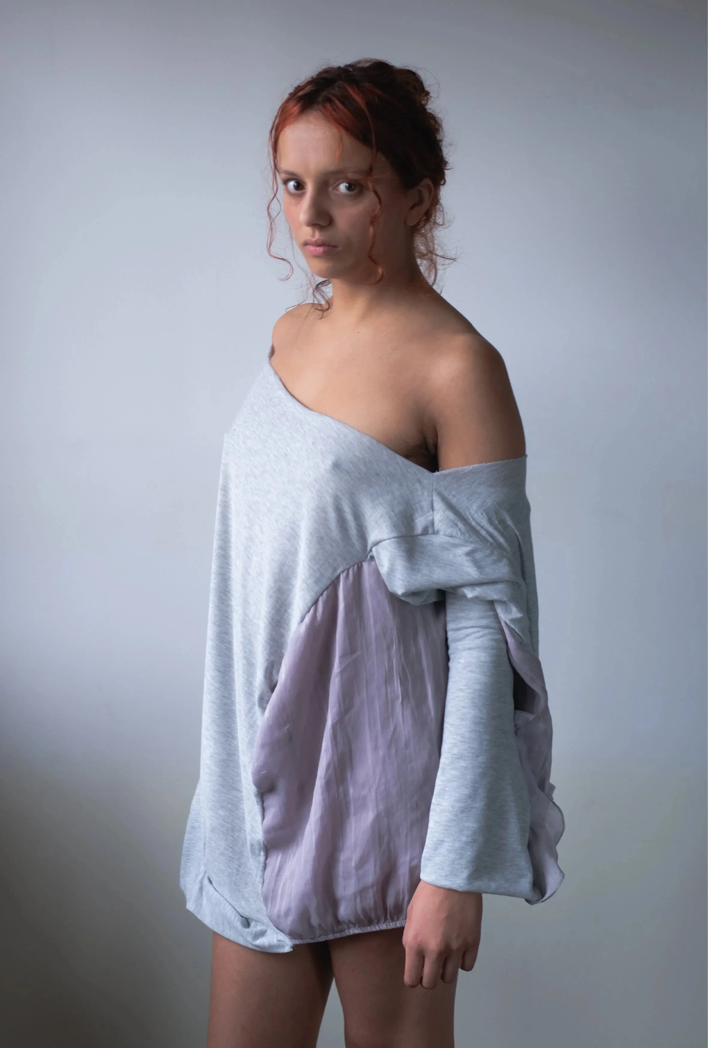 — Off-shoulder top in light grey cotton and sheer purple viscose made from an upcylced top and gathered details on the sleeves