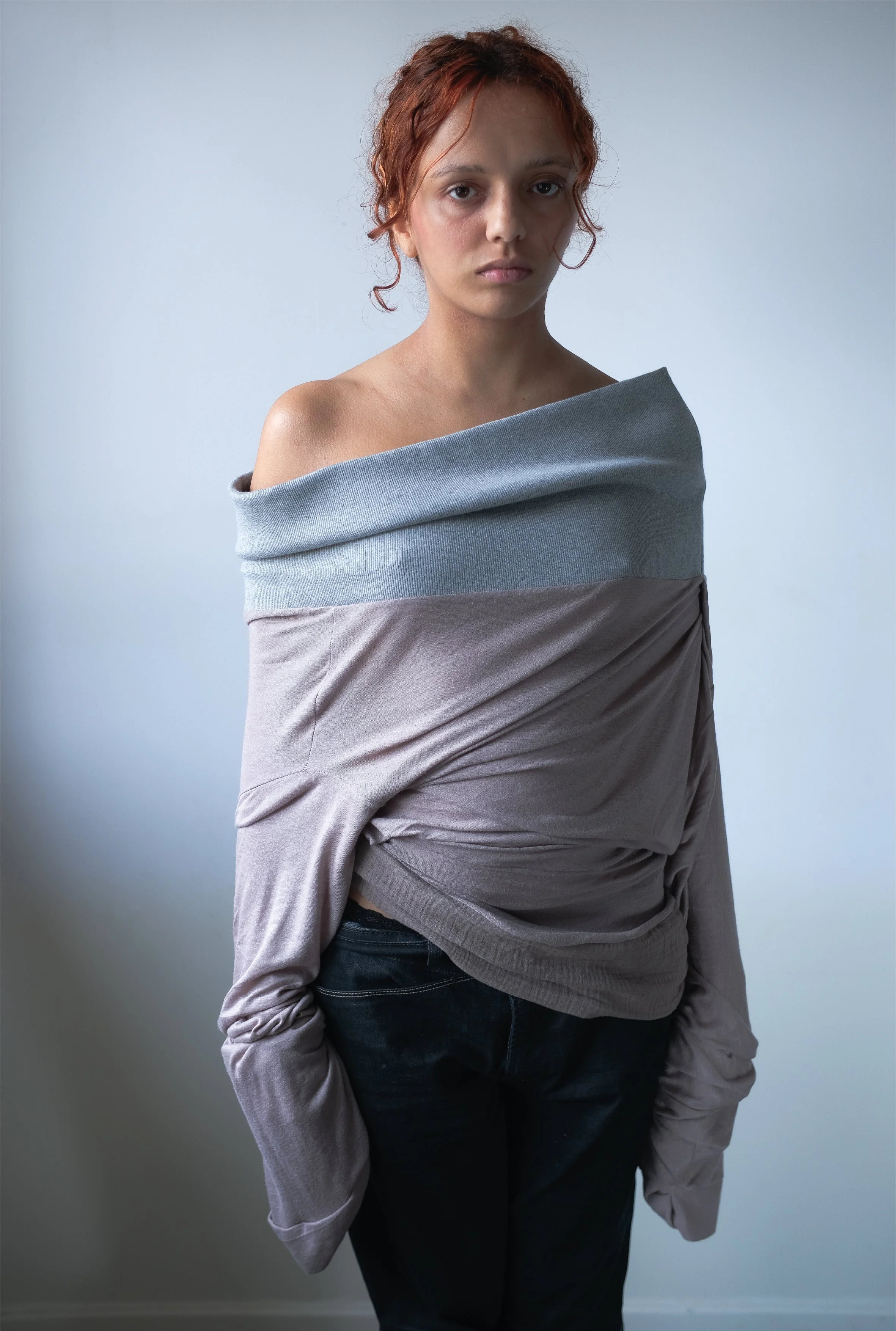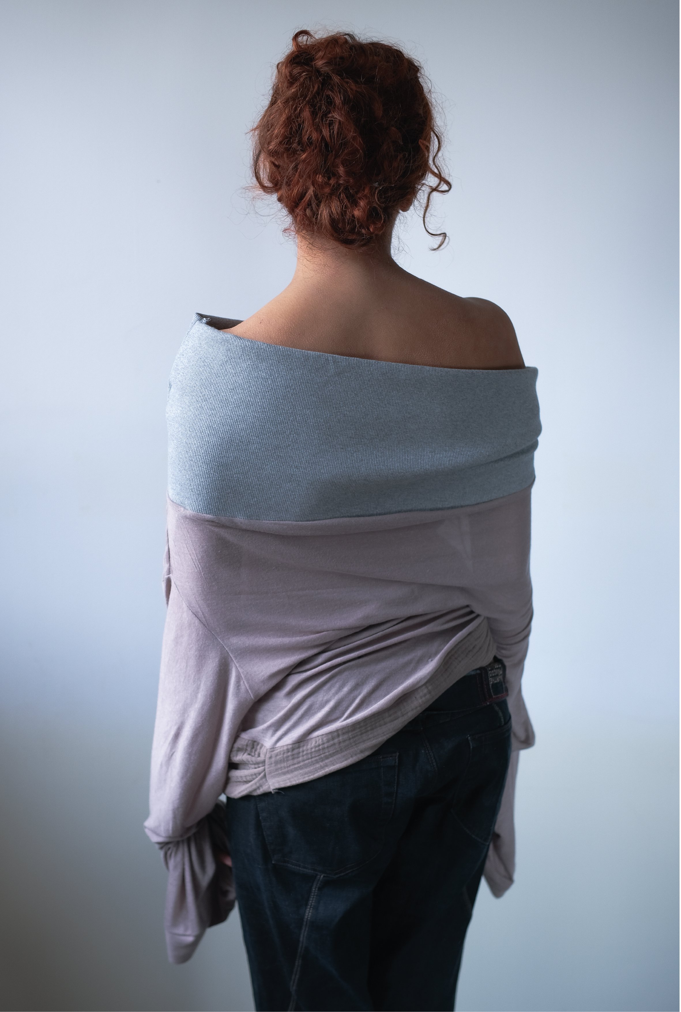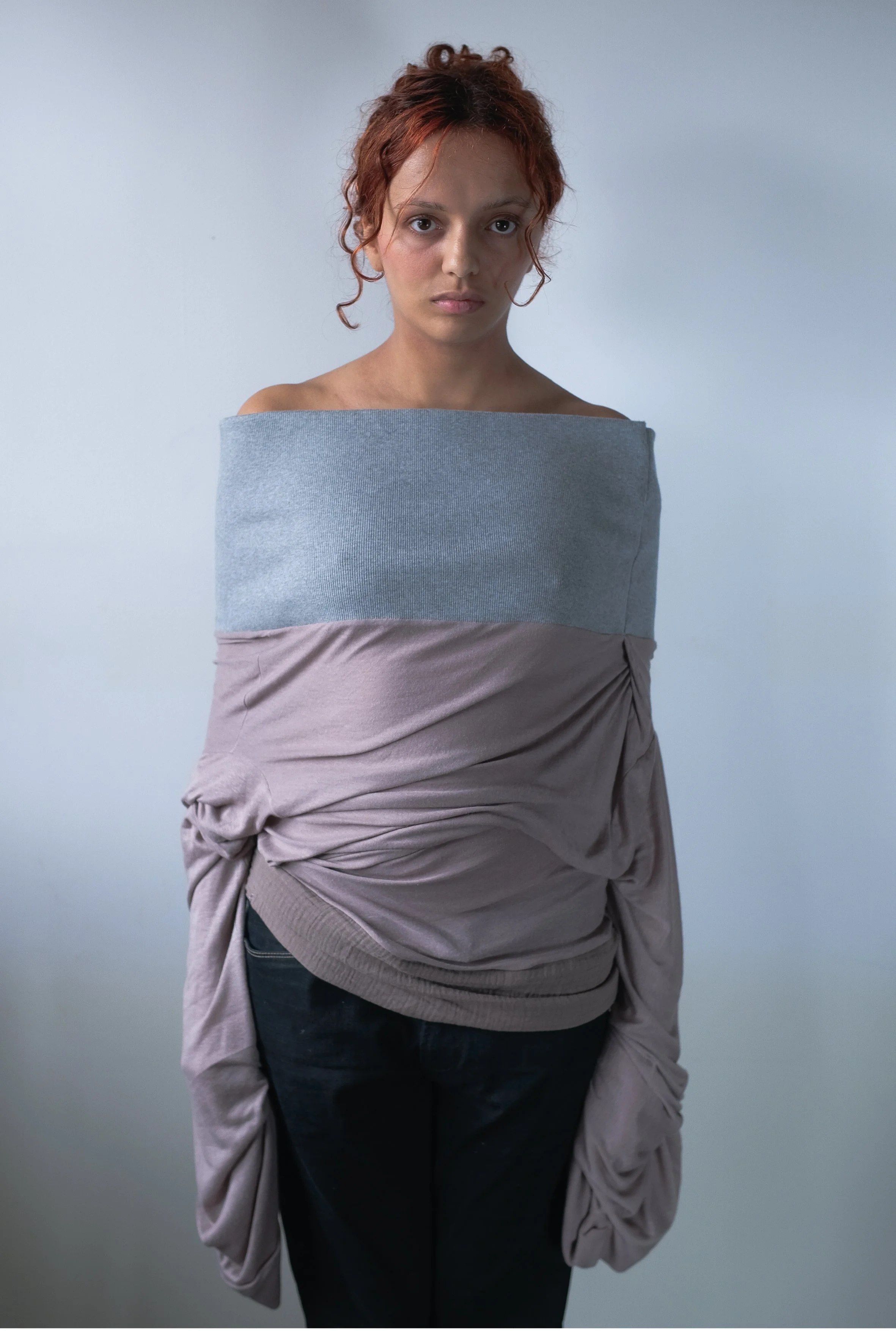 — Long sleeve top with ruffled details made from an upcycled piece, and a maxi grey ribbon collar.